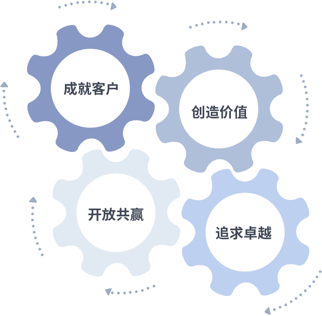 成就客户是一切决策的出发点,,,,创造价值是衡量所有工作的标准,,,,追求卓越是我们做事做人的态度,,开放共赢是我们的格局也是最终的结果。。。。价值观的齿轮环环相扣,,推动着组织里的每个人不断向前。。。。