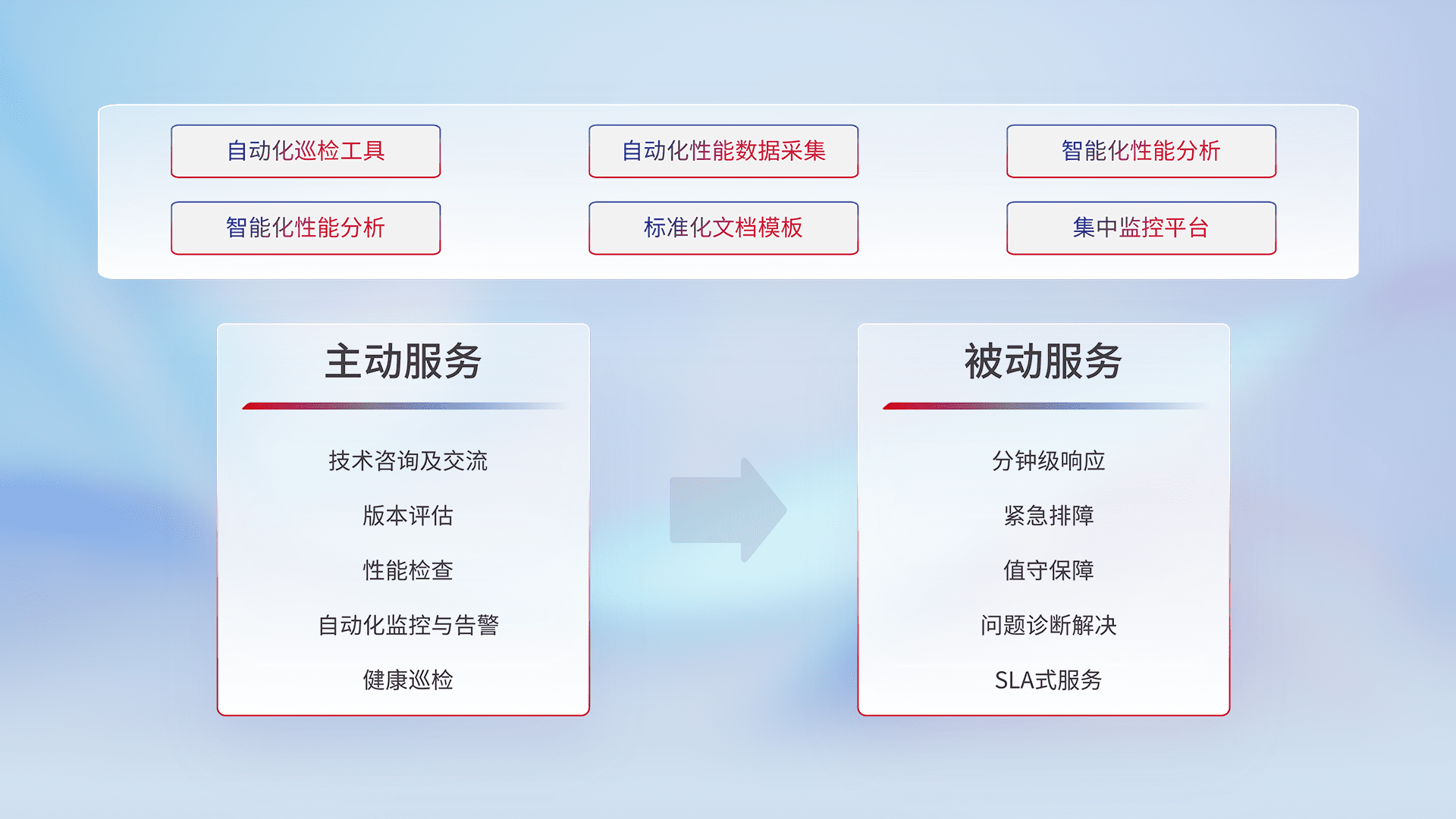 智能化工具和标准化文档,,保障服务质量,,提供主动服务(包含技术咨询、、版本评估、、、、性能检查、、、、自动化监控与告警、、、健康巡检)和被动服务包含(分钟级响应、、、、紧急排障、、值守保障、、、、问题诊断解决、、SLA服务)。。。